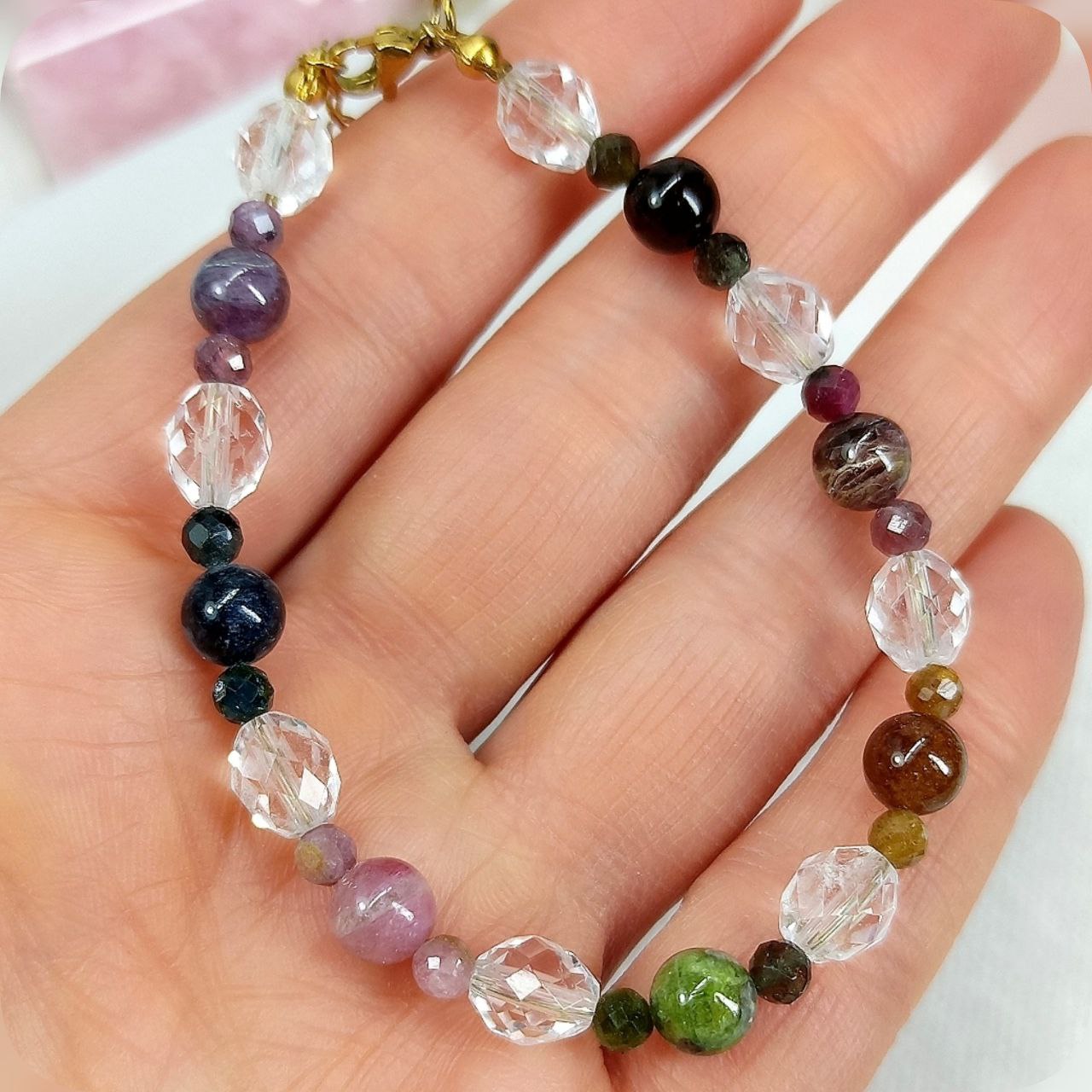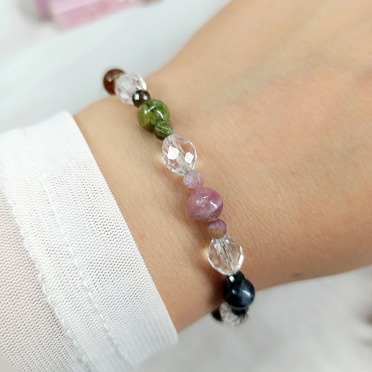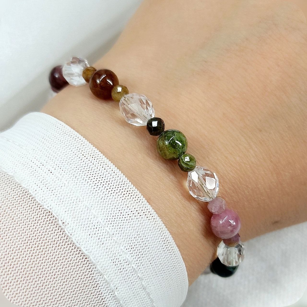 دستبند تورمالین هندوانه ای و کریستال کوارتز تراش جواهری