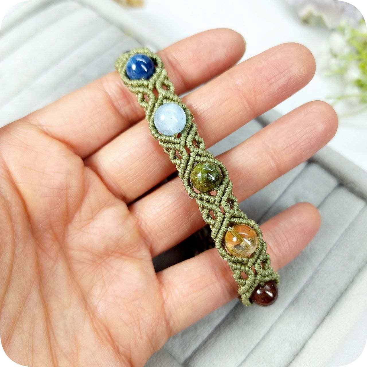 این دستبند از سنگهای درجه AAA شامل سنگهای گارنت سرخ ، گارنت نارنجی، سیترین، گارنت سبز، آکوامارین، کیانیت و امیتیست ساخته شده