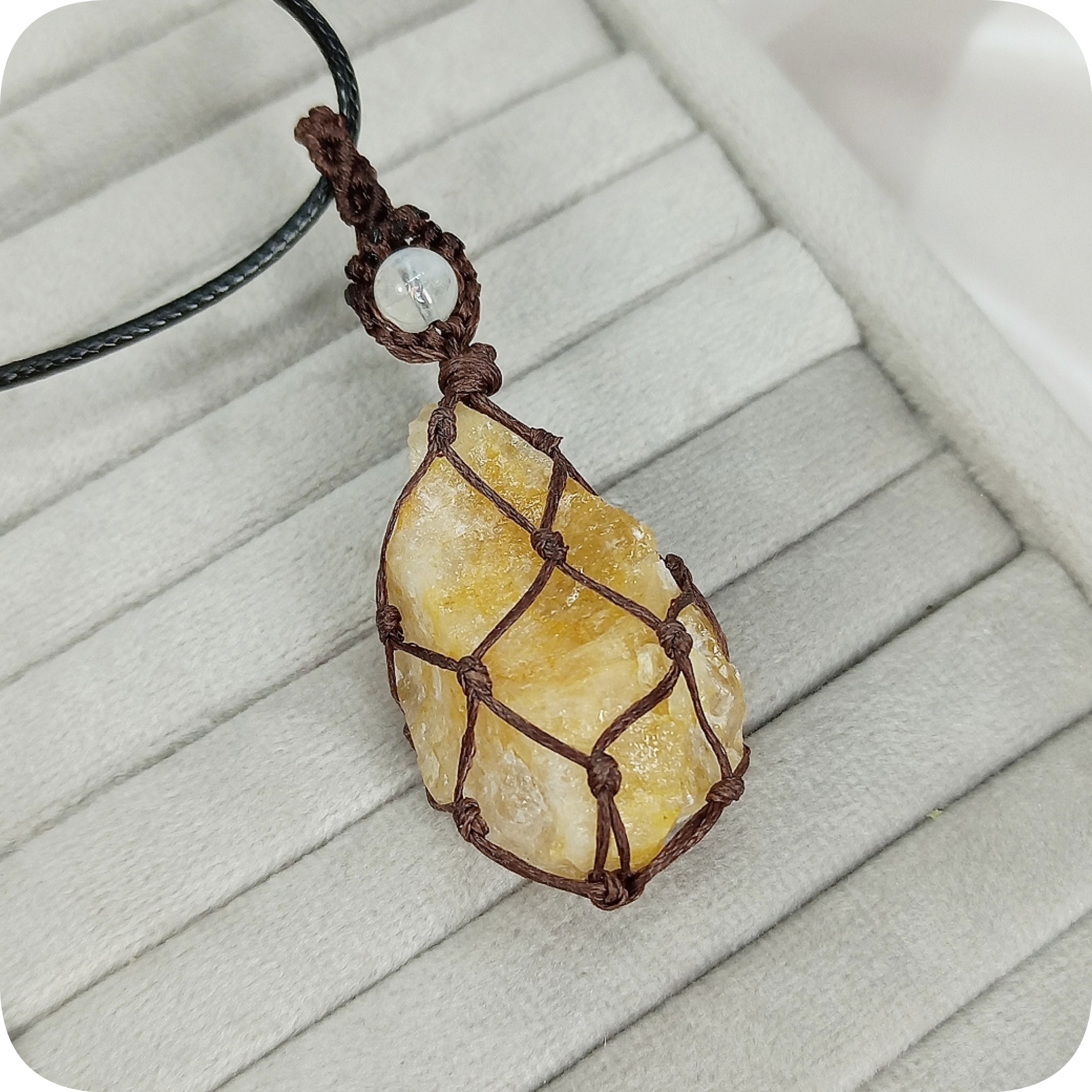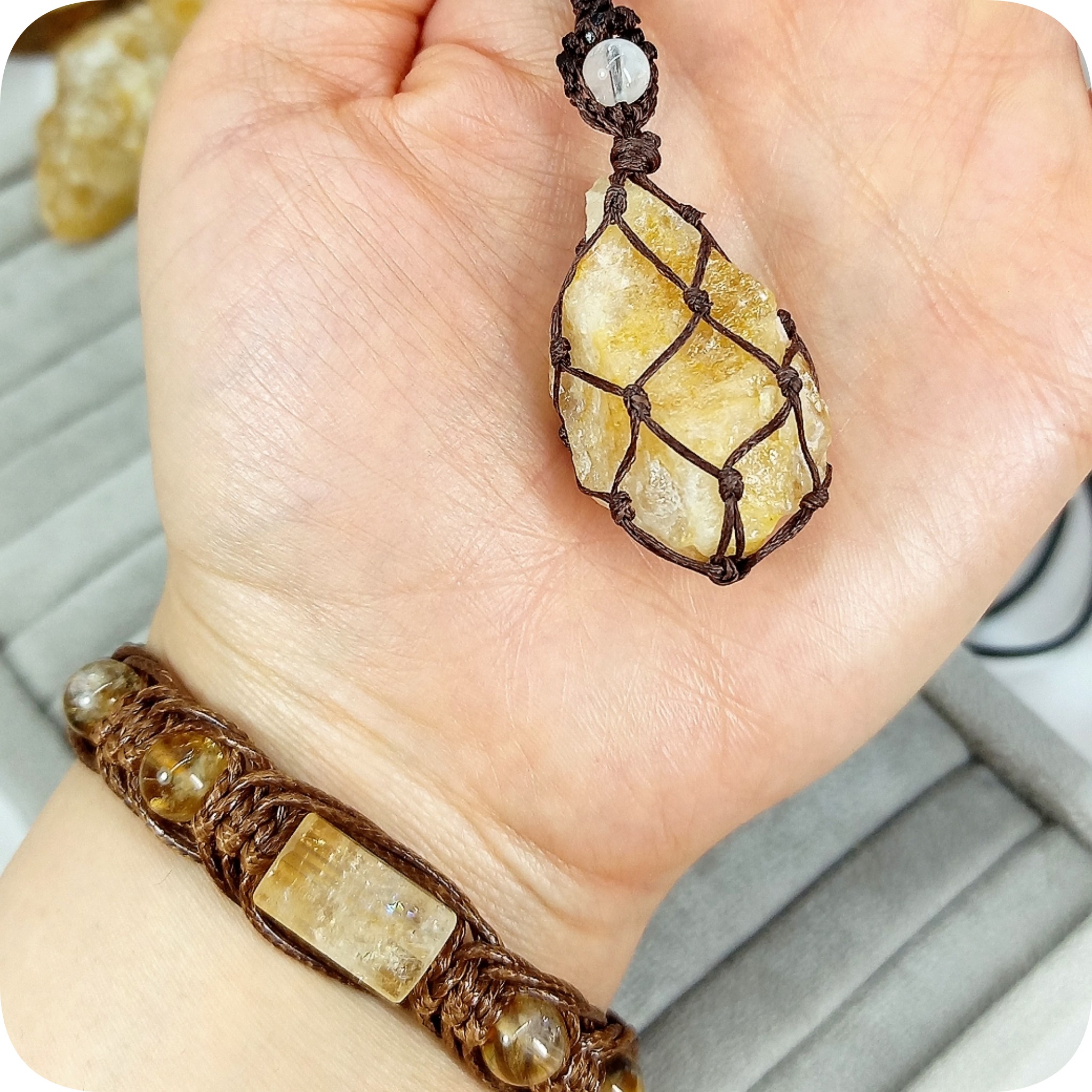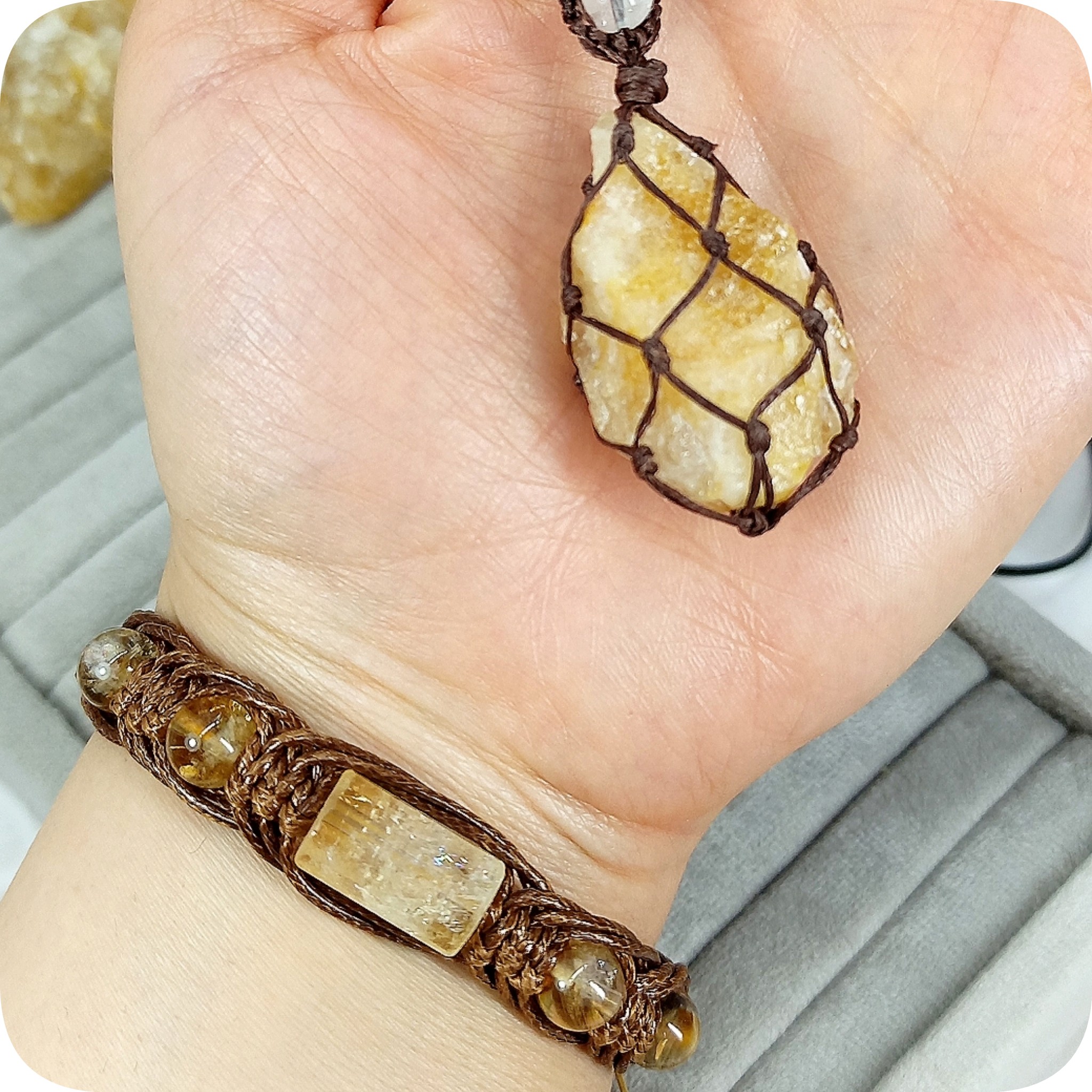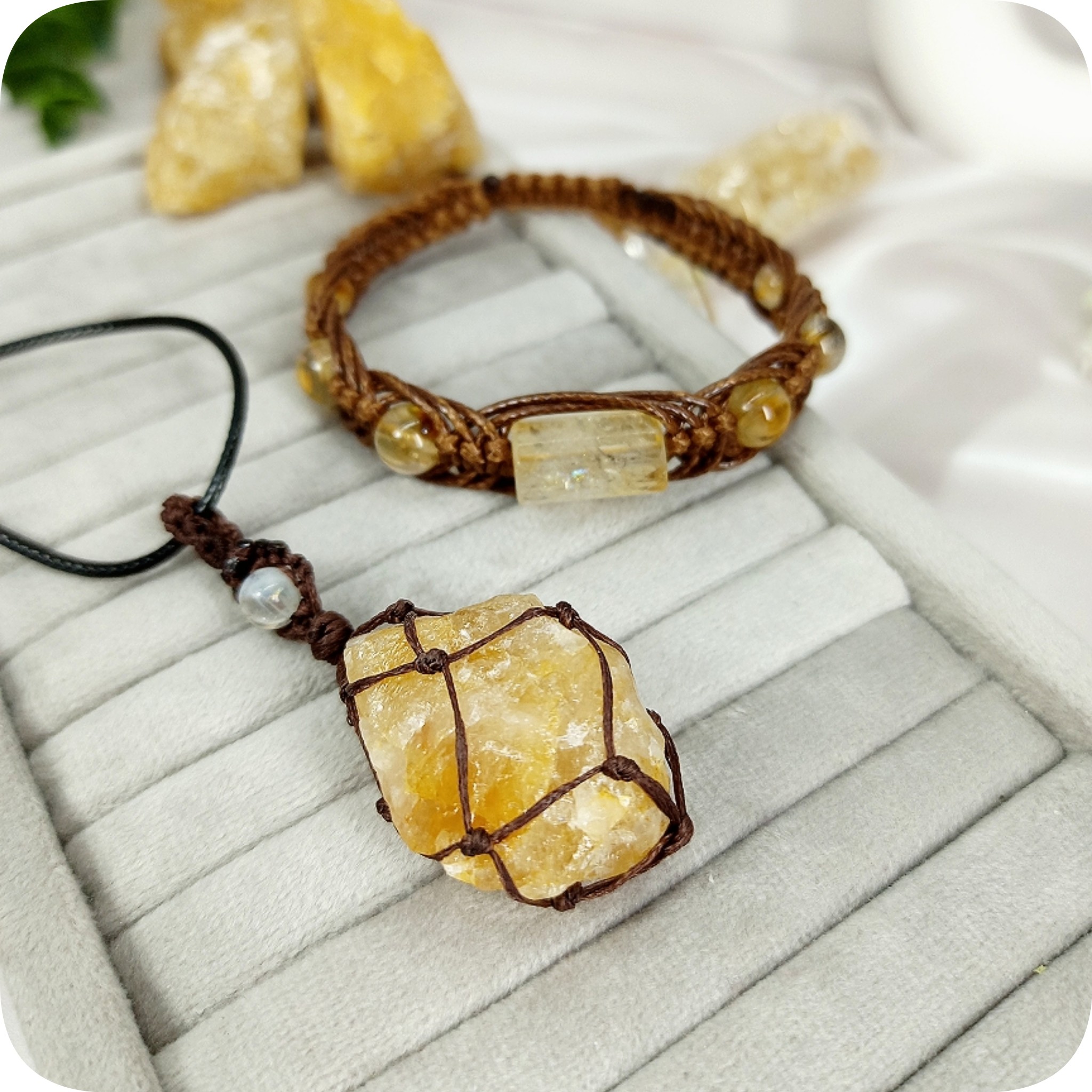 نیم ست سیترین ( گردنبند میکرومکرمه راف و دستبند بافت چرم)