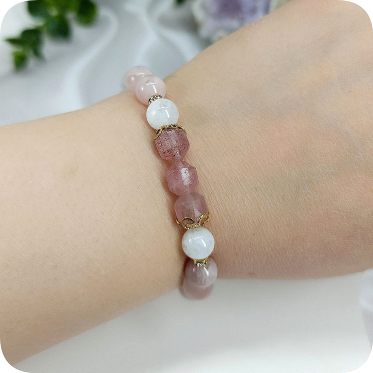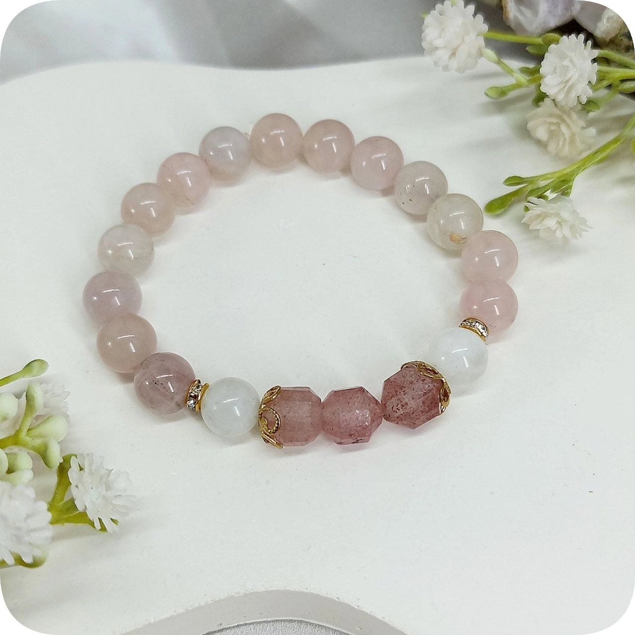 رزکوارتز: افزایش مهر ومحبت در رابطه +بهبود مشکلات قلبی وتنفسی مون استون: سنگ ماه میتواند قدرت زنانه و احساساتشان را تقویت و تنظیم کند کوارتز توت فرنگی : پاکسازی تمامی چاکراهای بدن تقویت سیستم ایمنی بدن پاکسازی اندام های بدن تقویت تمرکز: 2